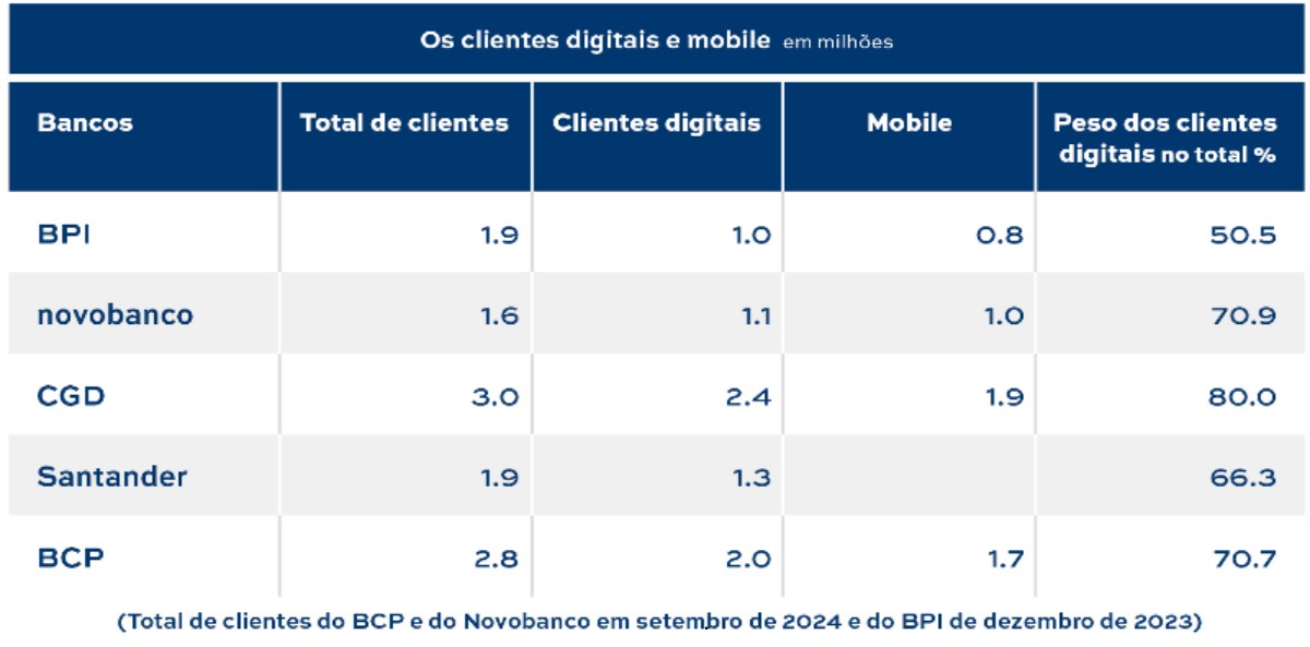 O BCP era mais parco nas suas informações. Considerava um crescimento de 4% da base de clientes face a 2023 e destacava o aumento de 10% dos clientes mobile, que representariam 71% do total de clientes no final de dezembro de 2024. Segundo a apresentação de resultados do terceiro trimestre em Portugal, o BCP tinha 2,76 milhões de clientes ativos, dos quais 62% mobile, mais 14% que em setembro de 2023, e digitais eram 72%, ou seja, 1,979 milhões, o que se traduzia em crescimento acelerado da utilização e venda mobile.